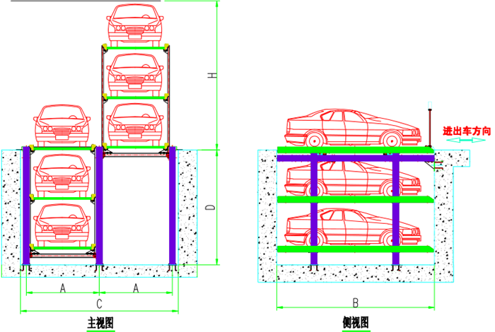 该设备每组上中下三个车台板为一体,同时做升降运动。机械下降到最低的时候,上层车台板正好与地面平,此时上层车位可以进出车辆。机械上升到中层车台板与地面平时,机械停止,此时中层车位可以进出车辆。机械上升到底层车台板与地面平时,机械停止,此时底层车位可以进出车辆。中层和底层车位停完车辆后,按“复位键”,设备将自动下降至基坑内。